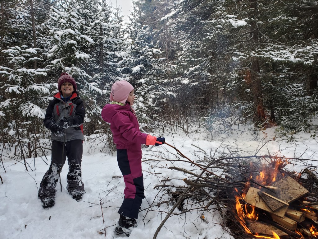 Ça a pris 4 ou 5 ballots, bien des découragements et de la frustration de mon garçon mais vous auriez dû voir la joie dans ses yeux quand enfin son bébé feu a grandi. Et la fierté dans mes yeux à moi. Ma fille n’a rien suivi de tout ça, beaucoup trop préoccupée à visiter le coin, couper des branches pour y mettre ses futures guimauves. Une fois elle est venue nous dire que c’était long, puis elle est retournée faire ses trucs. Un jour ce sera à son tour d’apprendre à faire un feu dans la neige.