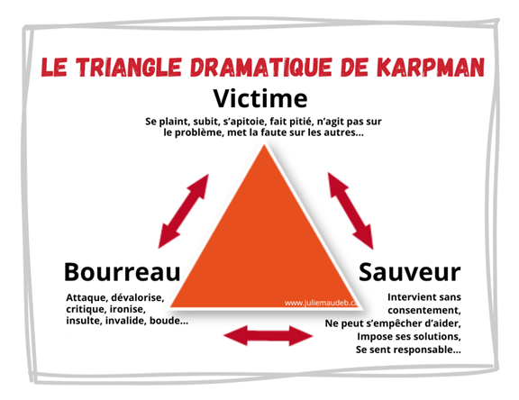 Mais revenons à nos comportements types. Sans surprise, vous comprendrez que de blâmer les autres pour son bonheur est une preuve infaillible que vous manquez un peu de reprise de pouvoir. Que vous n’êtes probablement pas à votre plein potentiel. Et ça ne transparaît pas seulement dans nos actes. Nos paroles aussi et même surtout nos pensées et nos émotions, et le reste des couches que l’on ne comprend même pas ! Et si le fait de se sentir mal à cause de quelque chose d’extérieur à toi fonctionne, cela est aussi vrai pour le fait de se sentir bien, ou trop bien. Quand ça arrive, tu as probablement mis ton pouvoir dans les mains d’autre chose que toi. Ici, je vais mentionner le triangle de Karpman. Avec l’image ci-dessous on voit la Victime, le Bourreau et le Sauveur. Une énergie de victime va attirer la malchance, les problèmes, la violence même parfois, et aussi les sauvetages non consentis. Une énergie de bourreau va au contraire avoir tendance à attirer des situations hors de son contrôle, des accidents parfois, une addiction et éventuellement un burn-out. L’énergie du sauveur aussi est capable de burn-out à force de se rendre indispensable. Bien qu’il veuille s’occuper de tout le monde, s’occuper de lui est bien difficile. Quand on est dans son pouvoir, on se situe au centre du triangle. Ni trop bourreau, ni trop victime, ni trop sauveur.